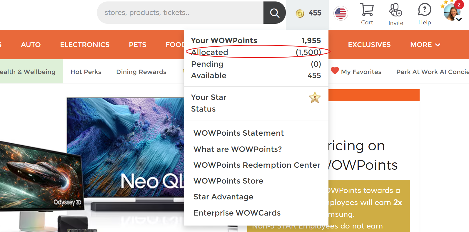 - Log in on the desktop site. Mouse over the WOWPoints counter next to the search. If you see a number next to "Allocated" like below, it means you have those WOWPoints allocated to a merchant. Most likely you started to redeem them in the past but it did not process completely.