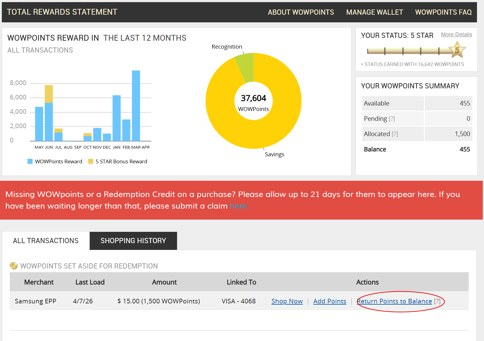 2. If you do see an allocation, click on "WOWPoints statement" in the same dropdown to visit your WOWPoints statement. Here you can manage your allocations and return them to your balance. If you are no longer trying to redeem them and would like to return them to your balance, you can do so using this link on your WOWpoints statement: